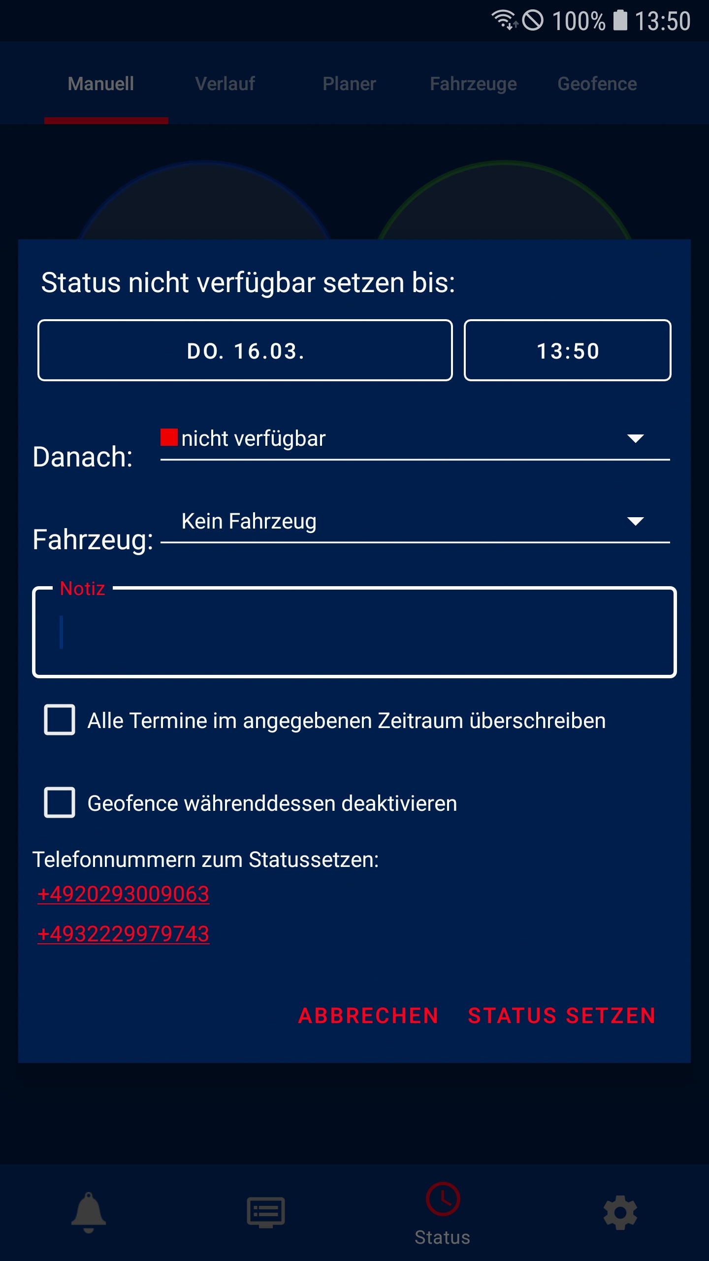 Sollten Sie aktuell kein Internet zur Verfügung haben, möchten aber trotzdem einen Status abgeben, so können Sie eine der im unteren Bereich des Fensters aufgelisteten Nummern wählen. Sofern für ihr Endgerät die Telefonnummer eingerichtet ist, kann darüber der Status auch ohne aktive Internetverbindung gesetzt werden. Voraussetzung hierbei ist nur, dass sich das Endgerät in einem GSM-Netz befindet.