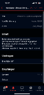 Bahnt sich im Verwaltungsgebiet eine Lage an in dessen Rahmen der Einsatz eines Krisenstabes nötig sein wird kann eine Mitteilung an die Mitglieder ausgelöst werden. Diese kann entweder auf das setzen des aktuellen Verfügbarkeitsstatus hinweisen oder eine Umfrage mit entsprechender Rückmeldung enthalten.