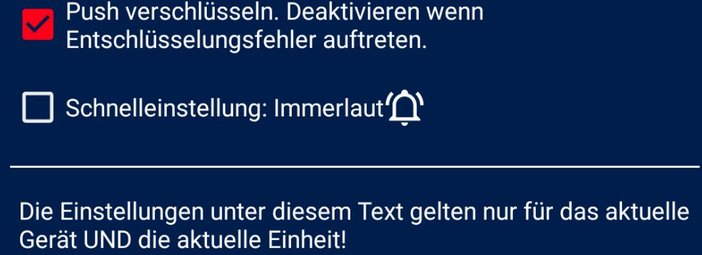 Über Quicksettings ab Android 7 (Google.com: Anleitung zu Schnelleinstellungen [Externe Seite]): Eine einfache Methode, ohne die App zu betreten Immerlaute Alarmierung für alle seine Einheiten abzuschalten. Diese Einstellungen gelten ZUSÄTZLICH/UND Verknüpft zu den Einstellungen in den Pusheinstellungen.