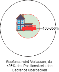 Das Gegenteil ist übrigens auch der Fall: so gilt ein Geofence in Android als verlassen, wenn nur noch 25% des Positionskreises mit dem Geofencekreis überschneiden. Selbst wenn sich der Positionskreis also genau mittig im zu kleinen Geofence befindet, wird ein Verlassen ausgelöst, sobald das Gerät an Genauigkeit verliert.